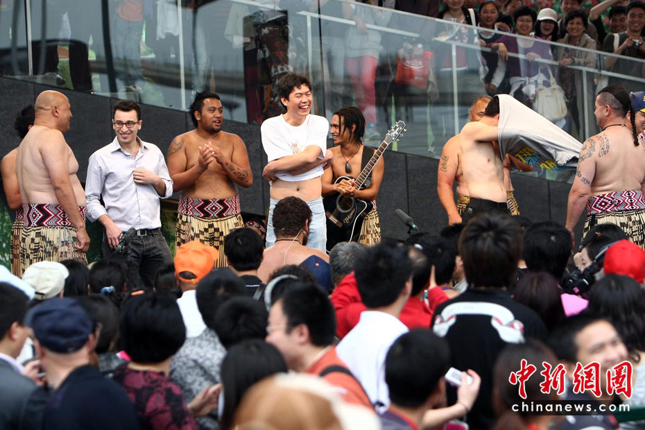 5月初,游客在上海世博會新西蘭館前赤膊上陣學跳毛利舞。中新社記者 杜洋 攝