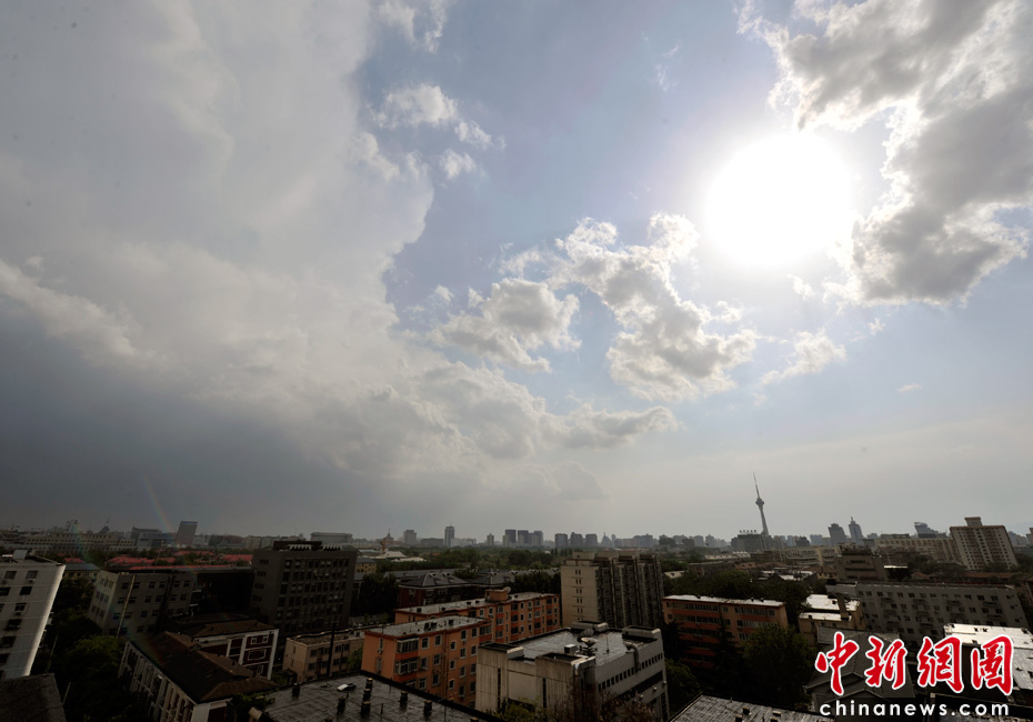 5月18日16時(shí)許,伴隨陣陣?yán)茁暰┏峭唤荡笥,降雨過(guò)后東部天空依然籠罩著烏云,而西邊卻已放晴。中新網(wǎng)記者 金碩 攝