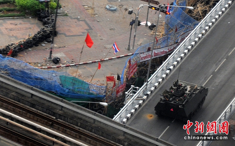 19日清晨,數百名軍警在武裝車輛的掩護下向反政府示威者在曼谷的大本營聚集。自上周四紅衫軍與政府在曼谷爆發沖突以來,已經導致39人死亡,數百人受傷。