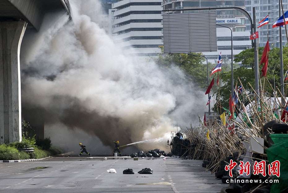 19日泰國軍方對聚集在首都曼谷市示威的反政府“紅衫軍”展開了驅(qū)散行動。軍方裝甲車已突破“紅衫軍”所筑路障,且至少有3人被槍擊中。圖片來源:中國新聞網(wǎng)