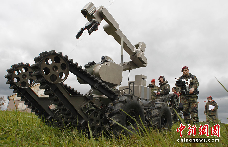 當(dāng)?shù)貢r(shí)間5月18日,德國(guó)南部哈默爾堡舉行了歐洲軍用機(jī)器人大賽。歐洲各國(guó)軍用機(jī)器人在大賽上一展身手。圖片來(lái)源:中國(guó)新聞網(wǎng)