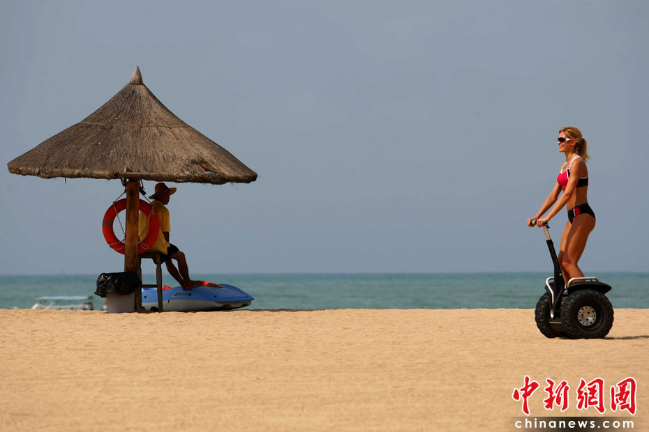 5月22日,一場沙灘趣味運動會在三亞海邊舉行,全球64位比基尼佳麗悉數登場,展現自己的運動天賦。中新社發 富田 攝