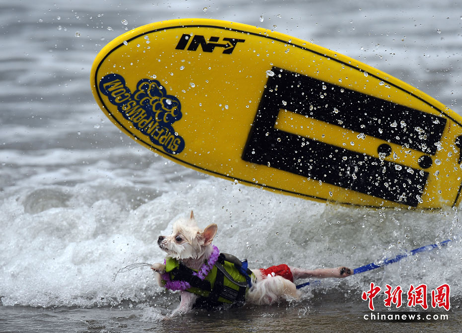 5月22日,美國加利福尼亞州圣迭戈舉行了一場妙趣橫生的狗狗沖浪比賽。圖片來源:中國新聞網