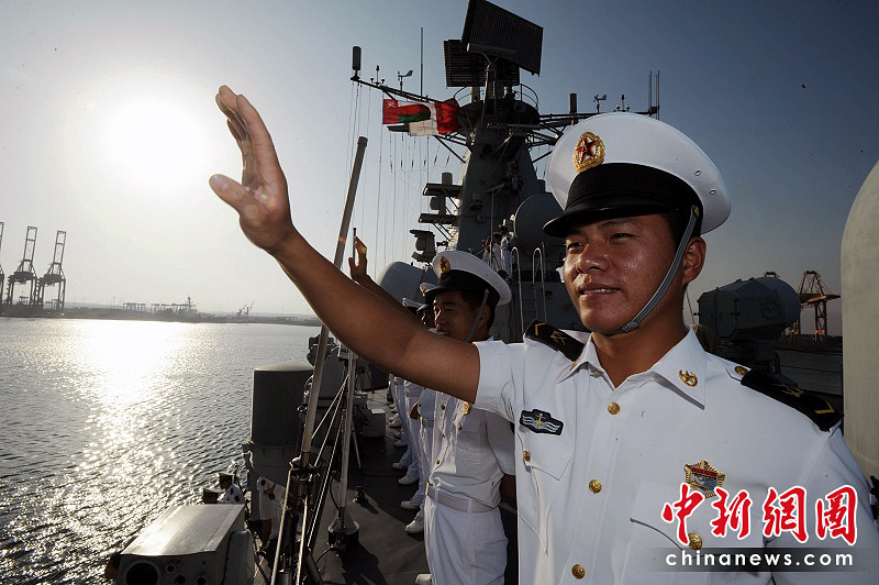 護航官兵向前來迎接的中國駐阿曼使館官員、海軍先遣組成員、中遠西亞公司員工等人群揮手致意。江山 攝