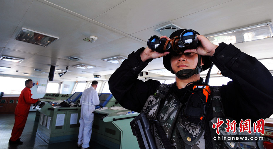4月13日上午9時(shí),特戰(zhàn)隊(duì)員在駕駛室瞭望警戒。船長(zhǎng)戴濤說,有特戰(zhàn)隊(duì)員在身邊,即使航行在海盜猖獗的亞丁灣海域,心里也特別踏實(shí)。江山 攝