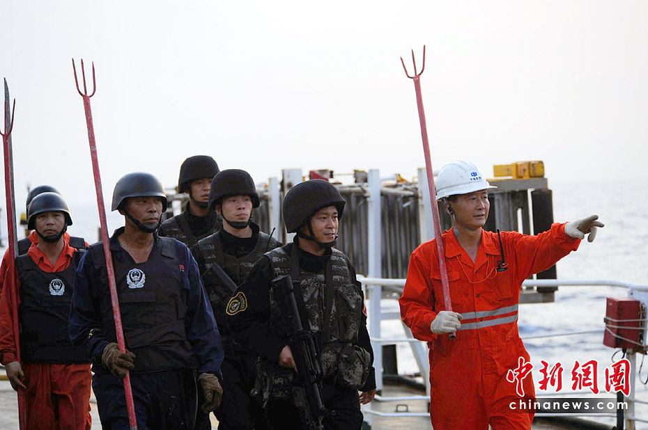 早晨和黃昏是海盜高發時段,特戰隊員與“嘉永山”輪反海盜小組聯合巡邏警戒。江山 攝