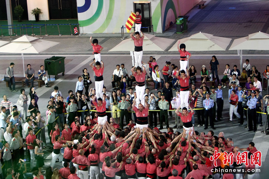 5月25日,西班牙“人塔”在上海世博會歐洲廣場上逐層壘起,為西班牙加泰羅尼亞周助興!隘B人塔”(HUMAN WALL),是西班牙加泰羅尼亞地區最具傳統特色的民俗節慶活動,起源于18世紀末加泰羅尼亞南部的巴爾斯。后來,“疊人塔”活動逐漸在加泰羅尼亞其他地區流行,進而風靡整個西班牙。中新社發 杜洋 攝
