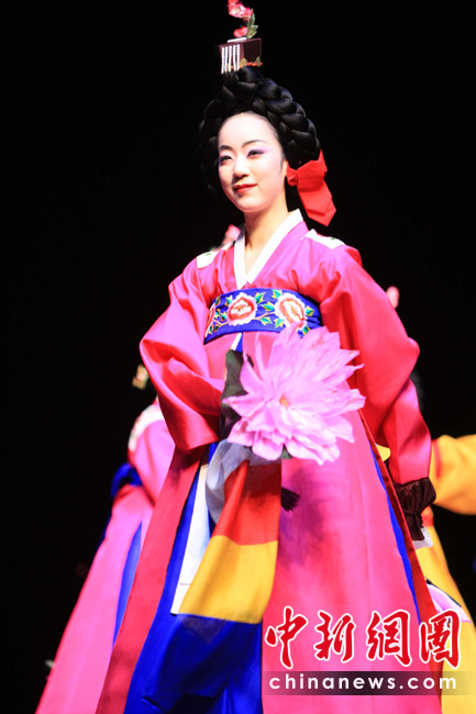 5月26日,韓服時裝秀在上海世博會上演,其宮廷服裝為別致內容之一。當日是世博會韓國館日,韓國舉行多項文藝表演推廣該國文化。中新社發 潘索菲 攝