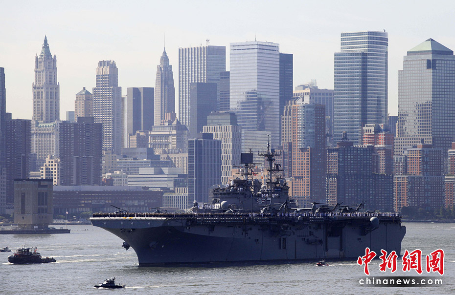 當地時間5月26日,美國第23屆紐約艦隊周開幕,包括“硫磺島”號兩棲攻擊艦在內的11艘參加艦隊周活動的軍艦由南向北在哈得孫河面上游弋。紐約民眾將以?吭诼D哈得孫河86號碼頭的“無畏號”航母博物館為中心,展開為期一周的慶祝和紀念活動。圖片來源:中國新聞網
