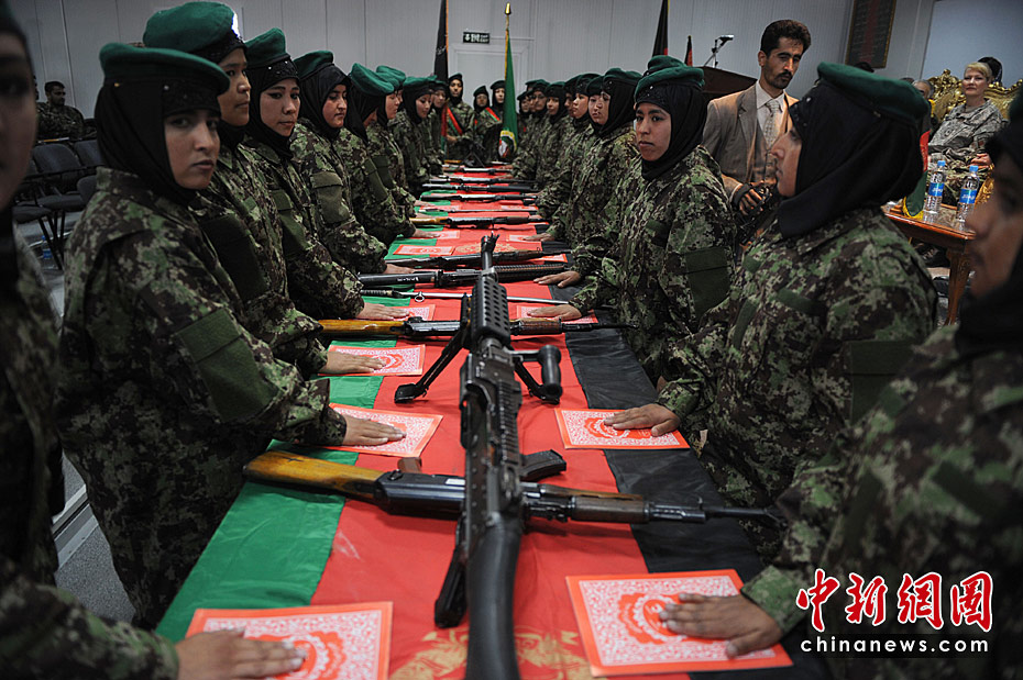 當(dāng)?shù)貢r間5月27日,阿富汗首批女軍官在首都喀布爾舉行畢業(yè)宣誓儀式。這是阿富汗軍隊征召女兵計劃的一部分,按照計劃她們將根據(jù)各自受教育程度被賦予不同的職位:接受過12年以上教育的女兵將擔(dān)任文職官;接受過9年到11年教育的將擔(dān)任軍士長;受教育程度更低的女兵則只能當(dāng)列兵。圖片來源:中國新聞網(wǎng)