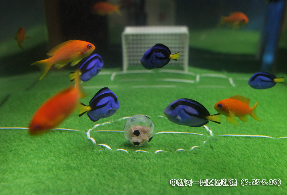 5月23日,日本橫濱八景島海洋世界水族館中,一群魚兒在“踢足球”,藍色魚代表日本隊,橘色魚代表荷蘭隊。在2010年南非“世界杯”上,日本將迎戰荷蘭隊。 圖片來源:中國新聞網>>點擊觀看詳細內容