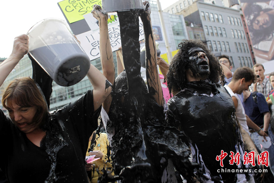 5月28日,美國環保主義者在紐約曼哈頓的一家加油站前,身上涂灑黑色顏料,以此抗議墨西哥灣原油不斷泄露。