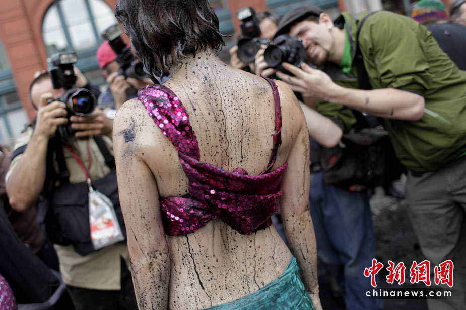 5月28日,美國環保主義者在紐約曼哈頓的一家加油站前,身上涂灑黑色顏料,以此抗議墨西哥灣原油不斷泄露。