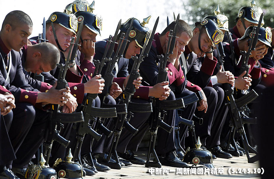 24日(周一),哥倫比亞波哥大,洪都拉斯總統(tǒng)訪問哥倫比亞,士兵們在歡迎儀式前休息。