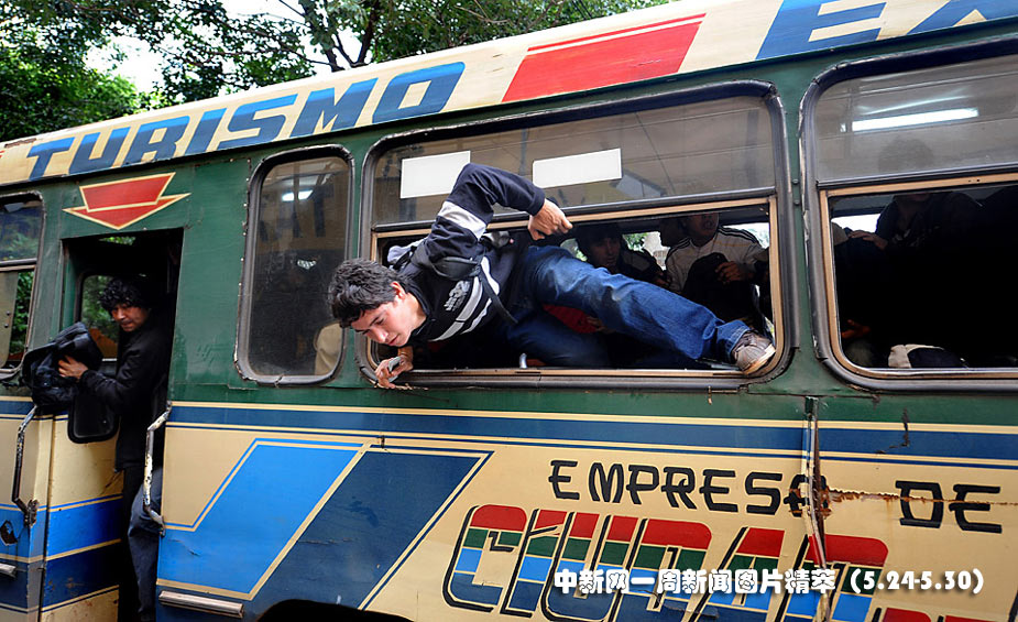 27日(周四),在巴拉圭首都亞松森,示威者向公交車投擲石頭,乘客們紛紛跳出公交車。部分公交車司機(jī)舉行罷工,要求加薪。