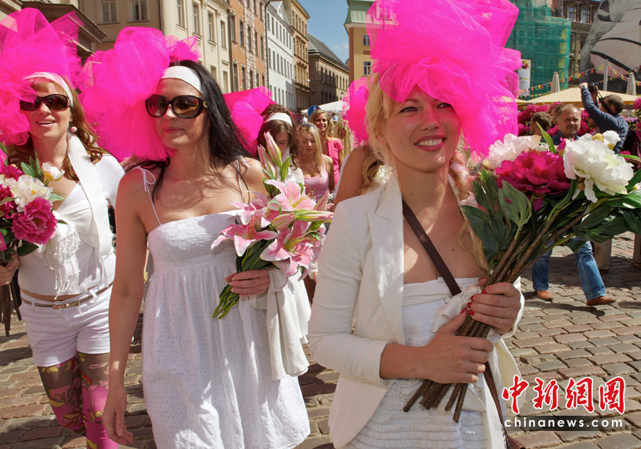 5月29日,在拉脫維亞首都里加,眾多金發美女身著艷麗裝扮在街頭游行,大秀嫵媚身材。