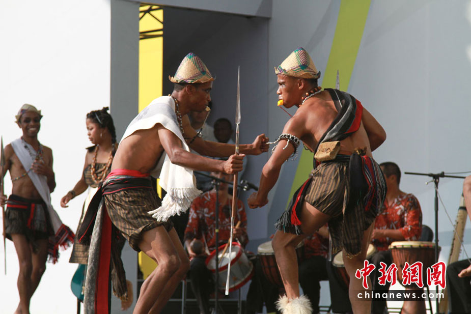 5月30日,馬達(dá)加斯加肯特思米諾歌舞團(tuán)在世博園非洲廣場表演比洛傳統(tǒng)儀式,逼真的神態(tài)、激情的表演,博得許多參觀者稱贊。當(dāng)天是馬達(dá)加斯加館日,世博中心內(nèi)舉行了其國家館日活動,馬方和中方代表共同出席。中新社記者 殷春永 攝