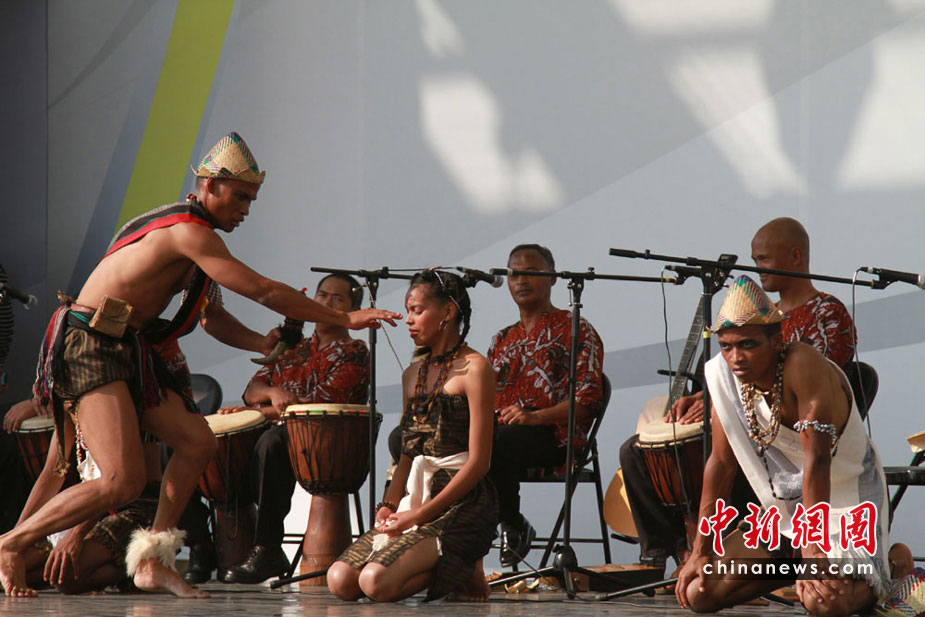 5月30日,馬達加斯加肯特思米諾歌舞團在世博園非洲廣場表演比洛傳統儀式,逼真的神態、激情的表演,博得許多參觀者稱贊。當天是馬達加斯加館日,世博中心內舉行了其國家館日活動,馬方和中方代表共同出席。中新社記者 殷春永 攝