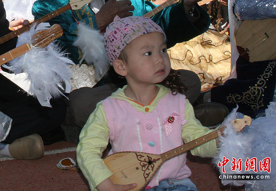 5月30日,新疆托里縣28個民族10495人共同參加冬不拉樂器表演,創下上海吉尼斯世界紀錄。萬人同奏的哈薩克族樂曲名為《凱乃斯》,漢語意為“和諧”。圖為參加表演的小樂手。中新社發 王小軍 攝