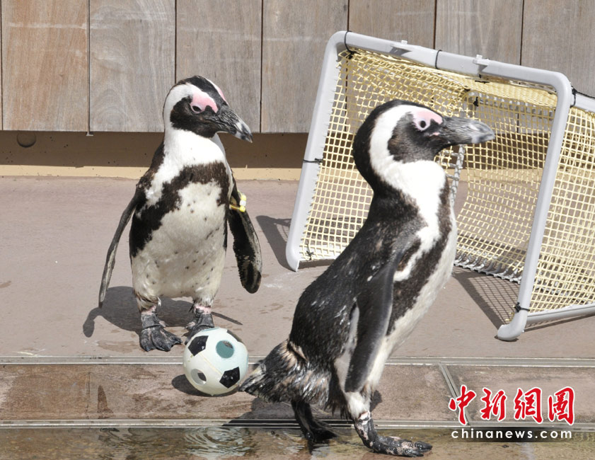 企鵝水族館里“踢足球”迎接世界杯