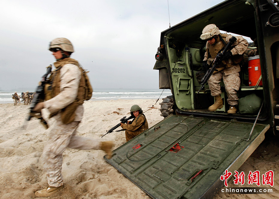 當地時間6月4日,約5000名水兵和陸戰隊員在美國加利福尼亞州舉行了代號為“黎明突擊”的搶灘登陸軍事演習。圖片來源:中國新聞網