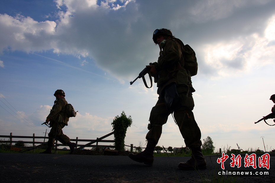 6月5日,諾曼底登陸66周年前夕,一批演員身著二戰(zhàn)時期美軍軍服,在法國諾曼底卡倫坦重現(xiàn)了這次著名的戰(zhàn)役。