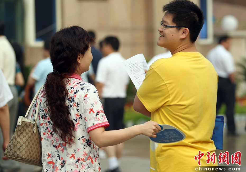 6月7日,為期兩天的2010年普通高等學校招生全國統一考試開考,全國將有957萬考生走進考場。圖為母親為兒子扇風降溫。中新社發 蘇丹 攝
