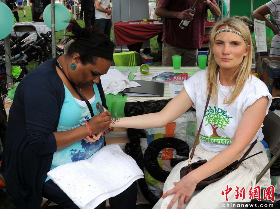 當(dāng)?shù)貢r間2010年6月6日,英國倫敦舉行卡姆登綠色市集(Camden Green Fair),這是英國倫敦每年環(huán)保領(lǐng)域的“重頭戲”。本屆市集的主旨是要喚起大眾對環(huán)境問題的關(guān)注,選擇更加可持續(xù)發(fā)展的生活方式。據(jù)活動主辦方預(yù)計,本屆市集將吸引來自英國各地和世界各國的2萬多人參加。圖為本次活動的組織者Sinclair Eiloart(右)在體驗印度手繪藝術(shù)。Fiona/攝 Fiona 馬小剛/文