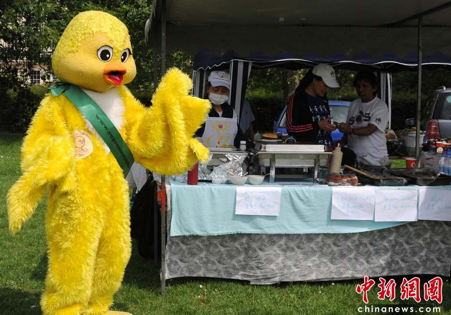 當地時間2010年6月6日,英國倫敦舉行卡姆登綠色市集(Camden Green Fair),這是英國倫敦每年環保領域的“重頭戲”。本屆市集的主旨是要喚起大眾對環境問題的關注,選擇更加可持續發展的生活方式。據活動主辦方預計,本屆市集將吸引來自英國各地和世界各國的2萬多人參加。圖為打扮成小雞的素食主義者宣傳素食。Fiona/攝 Fiona 馬小剛/文