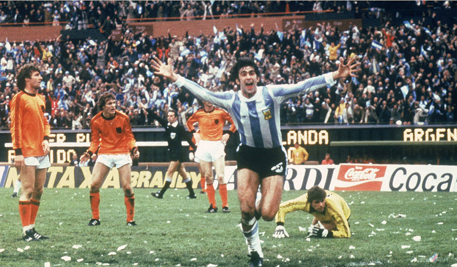 1978年,盡管荷蘭隊(duì)還是那么強(qiáng)大,但“全攻全守”在走下坡路,兩位劃時代的人物克魯伊夫和貝肯鮑爾退出各自國家隊(duì),阿根廷采用1962年巴西隊(duì)的4-3-3陣型,在河床體育場3比1擊敗荷蘭隊(duì)奪冠。 阿根廷的成功得益于主教練梅諾蒂的指揮以及一批球星的崛起。鐵門菲洛爾、隊(duì)長帕薩雷拉、突破高手阿爾迪列斯。74年那屆阿根廷隊(duì)中只有肯佩斯和豪斯曼兩人入選78年陣容。當(dāng)然,最引人注目的是一頭長發(fā)的肯佩斯,他是這屆世界杯的英雄……