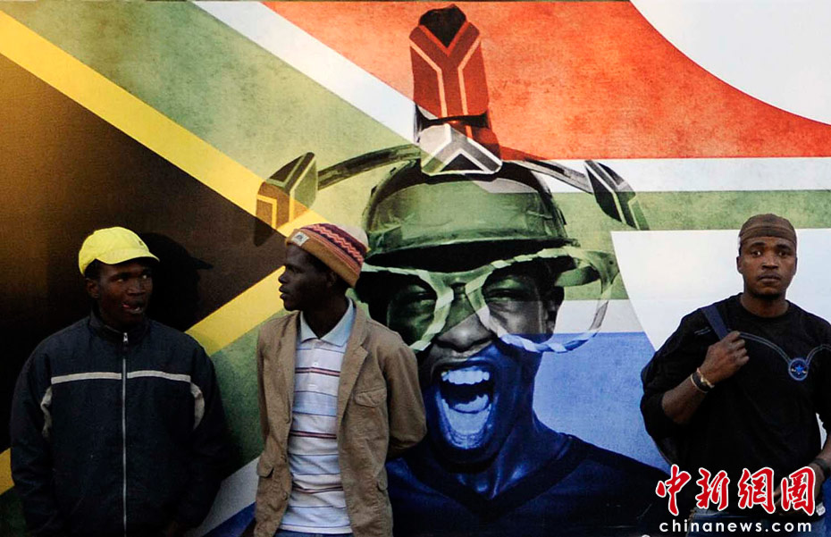 當(dāng)?shù)貢r(shí)間6月9日,民眾在南非約翰內(nèi)斯堡街頭的世界杯宣傳畫前,非洲大陸即將首次迎來足球世界杯。中新社發(fā) 廖攀 攝