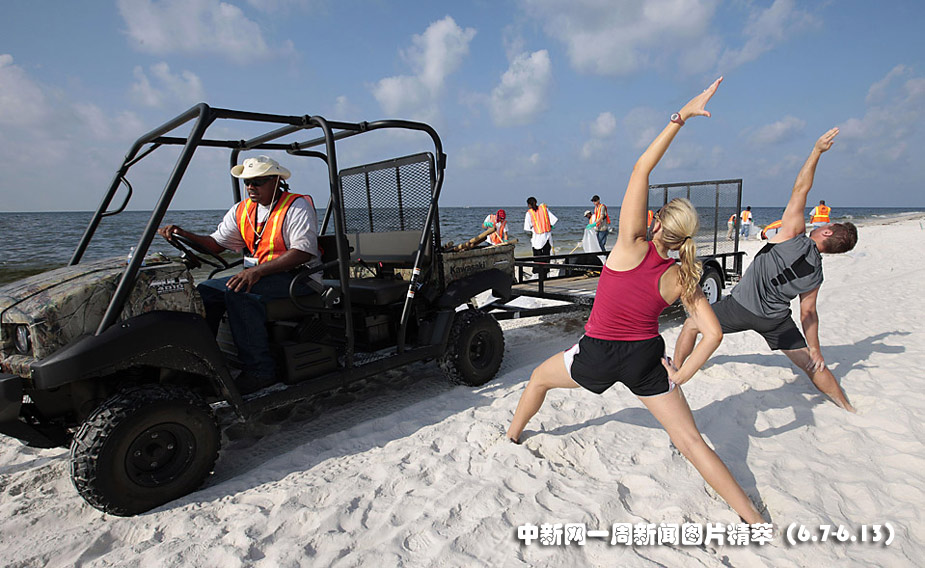 周三(9日)在美國阿拉巴馬州奧蘭治海灘,英國石油公司(BP)雇傭的清理工在清理焦油球,來自休斯頓的霍利戴(Kristy Holiday)和芬利(Deets Finley)在一旁練習瑜珈。