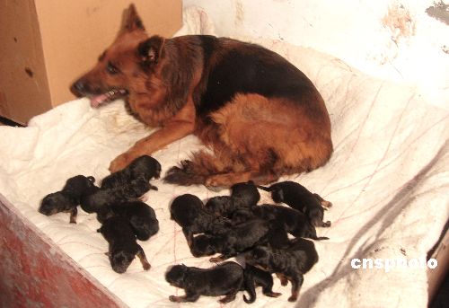 浙江臺州雅特銅業有限公司的一只護廠狼狗,12月15日中午12點左右,開始產崽,傍晚5點半產下第6只,直到第二天凌晨共產下14只狗崽。據獸醫介紹,一般情況下,狗一窩可產3只狗崽左右,一窩產5只的被稱作“五更狗”,一窩產10只狗崽的已不常見,而產下14只就更為稀奇。中新社發 吳達夫 攝