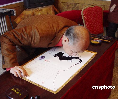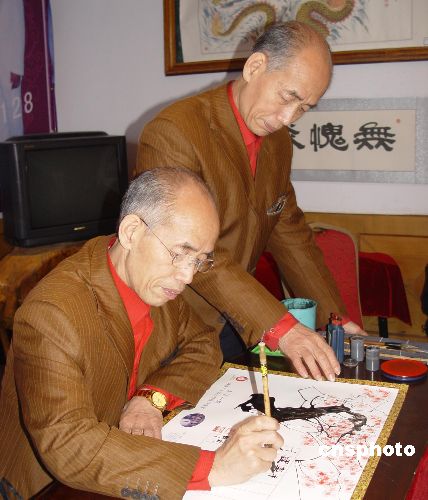 十二月二十一日,精通六十三項技藝的李偉、李雄孿生兄弟,向記者展示包括口吹畫、鋸琴在內的絕技。本月中旬,深圳雙胞胎兄弟李雄、李偉應邀來河南鄭州創業,兩兄弟現年六十四歲,他倆能畫油畫、版畫、國畫、水粉畫,還能在三十秒內吹出一株婀娜多姿的紅梅樹;還能以任意題材逆向題詩一首,其速度之快、繪制之精妙令人嘆為觀止。他們曾應邀出訪新加坡、澳大利亞、香港等國家和地區,并擔任“全球華僑華人推動中國和平統一大會”副秘書長出訪莫斯科。圖為兩兄弟現場合作表演絕技口吹畫及逆向題詩。中新社發 朱曉娟 攝