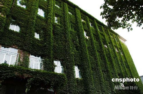 2008年7月13日,在北京798藝術(shù)區(qū)內(nèi),一棟五層樓高的辦公樓外墻被爬墻虎包裹的嚴(yán)嚴(yán)實實。有人戲稱此樓為京城“綠化最達(dá)標(biāo)”的大樓。中新社發(fā) 樊甲山 攝