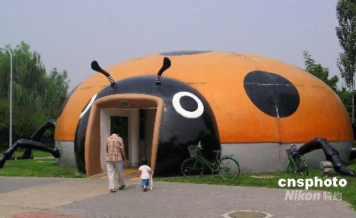 北京公廁在2008年發展中愈來愈千奇百怪,為目前北京將要開幕的殘奧會增加了色彩。圖為朝陽公園的七星瓢蟲公廁博得廣大兒童的認可、喜愛。中新社發 鄒憲 攝