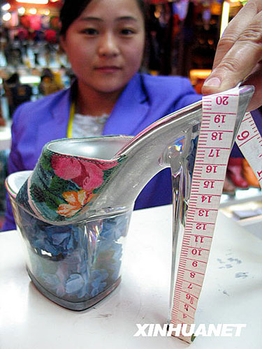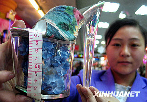 12月15日,在濟(jì)南一商場,工作人員展示“超級高跟鞋”。這款“超級高跟鞋”造型獨特,款式夸張,鞋底厚10厘米,鞋跟高20厘米,吸引了許多顧客的眼球。新華社發(fā)(趙曉明 攝)