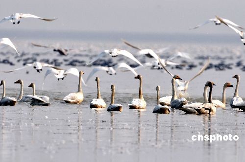 12月20日,大群雁類和鷸類候鳥在江西鄱陽湖星子縣沙湖山沙湖池上空飛翔。目前,中國第一大淡水湖江西鄱陽湖候鳥保護區八大湖池越冬棲息的珍禽候鳥總數已達30萬只,包括白鶴、白鸛等國家一級保護鳥類,以及雁類、鷸類、小天鵝、野鴨等珍禽候鳥。中新社發 段長征 攝