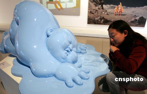 正在上海舉行的動(dòng)漫美學(xué)雙年展有許多作品趣味逗人,一名觀眾在《睡著了》作品旁做模仿狀。據(jù)悉,參展的近百件作品來自意大利、美國、中國大陸和臺(tái)灣地區(qū)。中新社發(fā) 潘索菲 攝