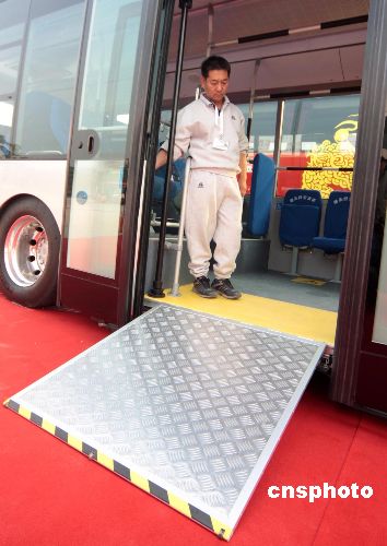 2008北京奧運電動客車人性化設計了落地車門。 國家電網展出的電代油奧運客車。