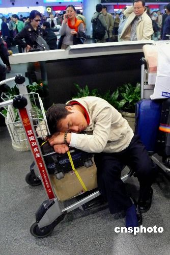 十月二十六日,一位旅客在北京首都國際機場候機大廳睡著了。當天,北京遭遇大霧天氣,北京氣象臺已發布大霧橙色預警信號。因能見度太低,交通受阻,航班延誤,大批旅客滯留機場。中新社發 王瑤 攝