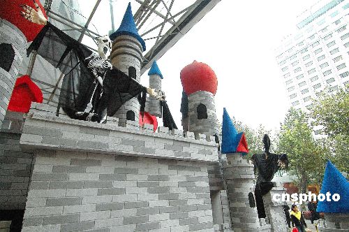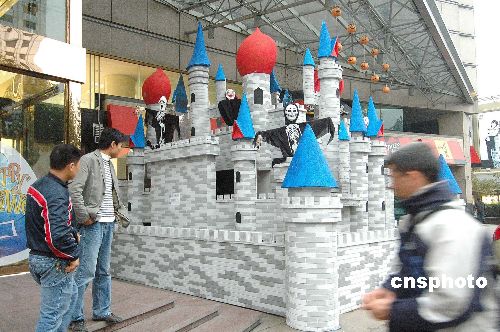 10月30日,兩座“鬼堡”出現在杭州一商店廣場。隨著“萬圣節”到來,杭州部分商家用各種形式的“鬼節”造型吸引顧客,抓住商機賺錢。中新社發 引煒 攝