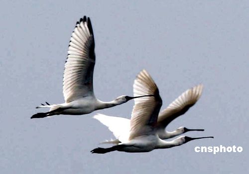 十一月四日,在福建福清市江鏡濕地上,四十多只黑臉琵鷺來到這里過冬。黑臉琵鷺為候鳥,是國際極度瀕危物種,現(xiàn)在全球只剩一千只左右,國際自然資源物種保護聯(lián)盟和國際鳥類保護委員會都將其列入瀕危物種紅皮書中,成為僅次于朱瀗的第二種最瀕危水禽。此外,還有二百多只黑嘴鷗、四千多只黑腹濱鷸、二百多普通鸕鶿等大量珍稀鳥類棲息于此。中新社發(fā) 楊婀娜 攝