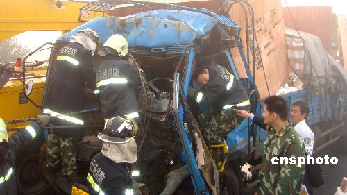 11月8日7時27分許,由于大霧,汾灌高速連云港浦南段發生三輛大貨車追尾相撞事故,造成二死二傷,傷者被成功救出后,已送往醫院搶救。中新社發 王春 攝