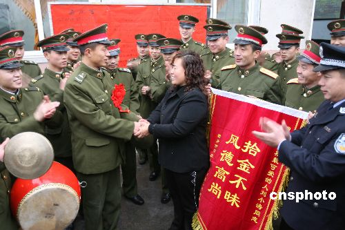 11月15日,河南省新鄉華爾惠燈飾有限公司總經理趙明惠帶著錦旗驅車找到濟南軍區某炮兵團士官劉小濤,向他表示感謝。劉小濤幾天前將趙明惠丟失的6萬元現金及時交給派出所。中新社發 唐金江 攝