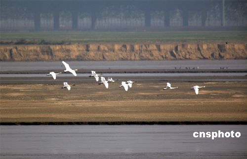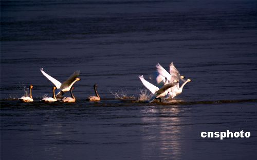 十一月二十日,來(lái)自北方的大天鵝在鄭州黃河上空飛翔、在水中嬉戲。這是今年入冬以來(lái),發(fā)現(xiàn)的大天鵝最大的種群。連日來(lái),鄭州黃河濕地保護(hù)區(qū)工作人員連續(xù)在保護(hù)區(qū)內(nèi)進(jìn)行鳥情觀察,共發(fā)現(xiàn)國(guó)家二級(jí)保護(hù)動(dòng)物大天鵝九十三只和灰鶴兩只,以及大種群分布的豆雁一千三百余只,綠頭鴨五百三十只,大白鷺三百三十二只。據(jù)推算,各種水鳥達(dá)到三十萬(wàn)只。中新社發(fā) 慎重 攝