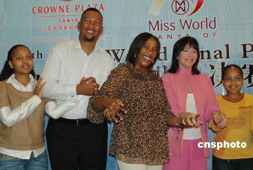 十一月二十九日,海南三亞,南非前總統曼德拉的長女(中)長孫(左二)現身海南三亞,在世界小姐機構舉行的新聞發布會(右二為世界小姐機構主席莫莉夫人)上呼吁更多的人關注艾滋病在全球的蔓延、關愛艾滋病患者。他們此行還帶來了家鄉的兒童合唱團,將于十二月一日晚舉行的第五十七屆世界小姐總決賽晚會上亮相。中新社發 尹海明 攝