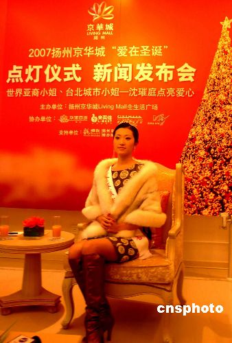 11月30日,揚州舉辦“愛在圣誕”點燈儀式及中國麥田計劃獻愛心新聞發布會。世界亞裔小姐、臺北城市小姐沈璀庭出席,并將于12月1日晚在揚州京華城廣場為21米高的巨型圣誕樹啟動“愛在圣誕”點燈儀式,并與“中國麥田計劃”愛心慈善團體攜手獻愛心!爸袊溙镉媱潯庇2005年成立,是一個為貧困地區兒童建立圖書室、捐贈衣物及創造讀書機會的民間志愿組織。中新社發 崔佳明 攝