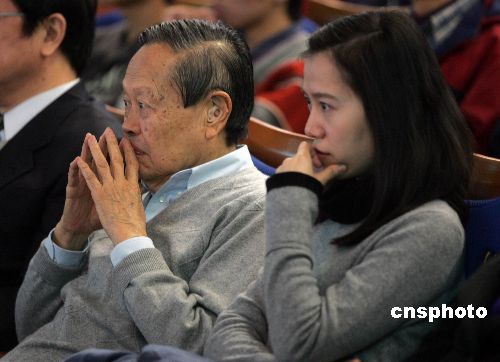 12月3日,數學大師陳省身逝世三周年紀念大會暨《陳省身與中國數學》新書首發儀式在天津舉行。諾貝爾獎獲得者、著名華人學者楊振寧攜妻子翁帆出席紀念活動。圖為楊振寧夫婦聆聽陳省身先生女婿、著名物理學家、香港科技大學校長朱經武院士的主題演講,演講題為《陳省身先生與我》。中新社發 祁小龍 攝