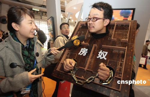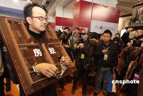 2007年12月11日,第九屆中國住交會在北京開幕。行為藝術家梁克剛的頭和雙手被“房奴”的鐐銬緊緊鎖住,他頻頻到各大房地產開發商的展臺“抗議”,表達自己的行為藝術。當行為藝術結束,打開“房奴”鐐銬后,該行為藝術家終于露出笑容。中新社發 吳芒子 攝